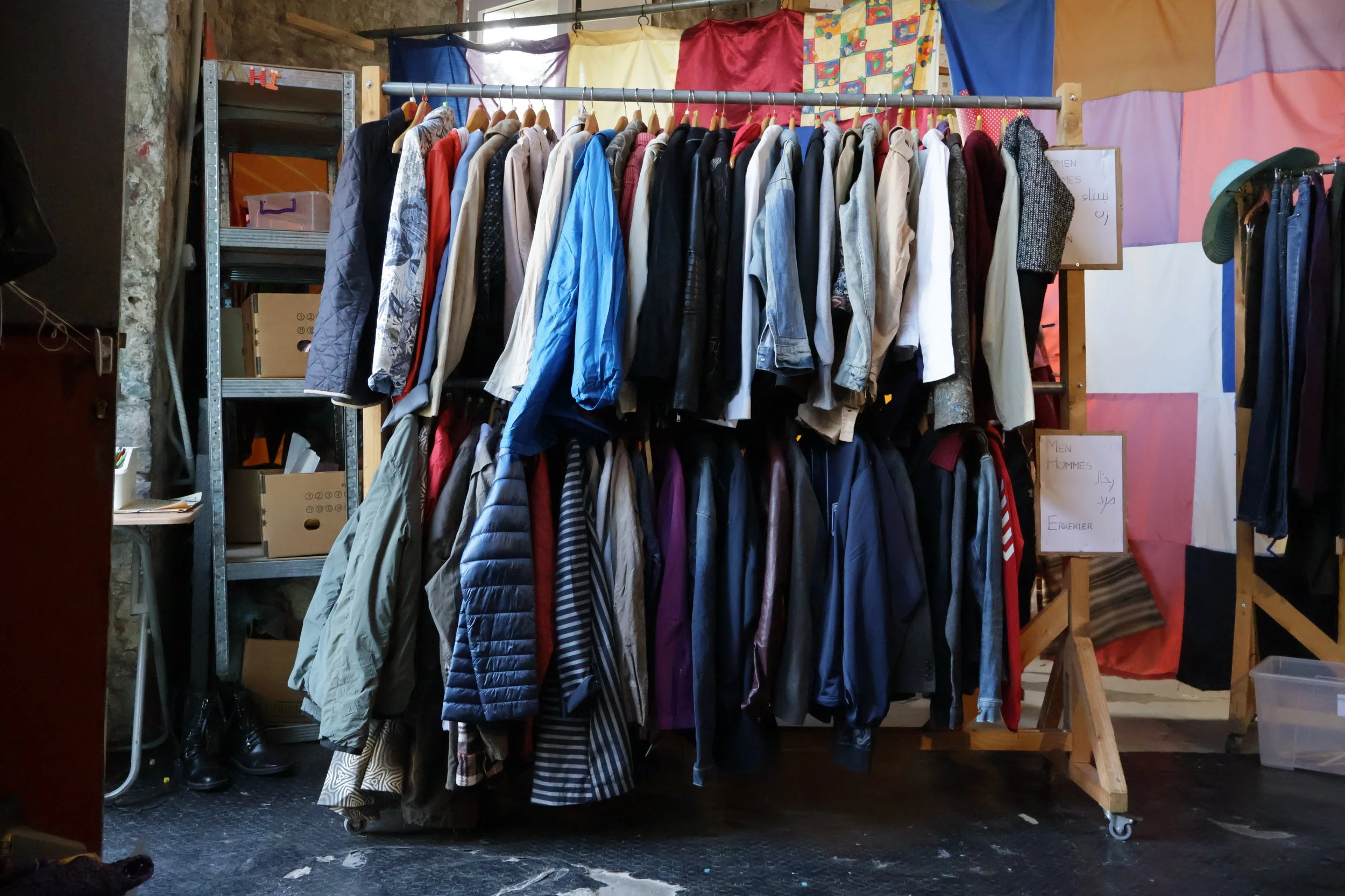 Rearrange the Free Shop, preparing winter clothes and shoes for distribution.